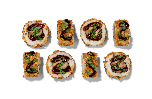 Sushi: 8x California mit Yakitori-Huhn, Röstzwiebeln und Teriyakisauce.
