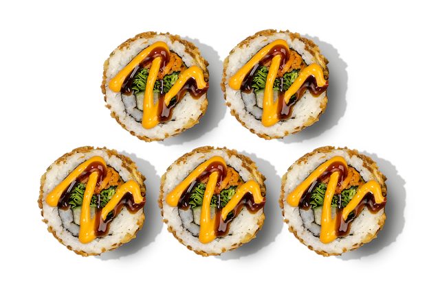 • 5x California XL Vegan Crunch (gefüllt mit Gurke, eingelegten Karotten, Avocado, Röstzwiebeln, Rucola, Chili-Creme und Teriyakisauce)