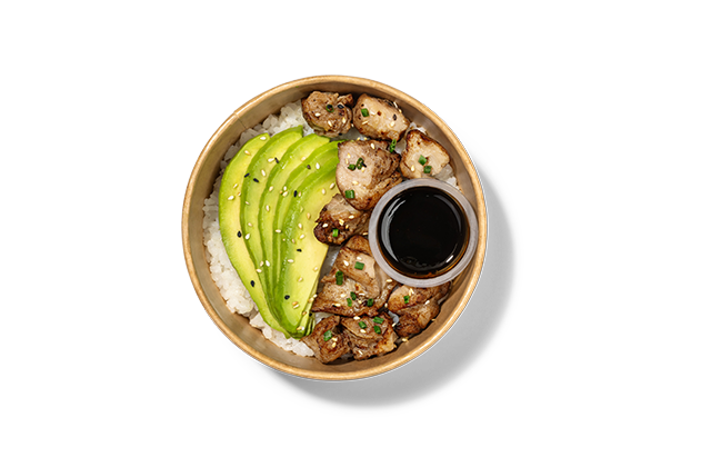 Inhalt: Reisschale mit Yakitori-Huhn, Avocado, Sesamsamen und Schnittlauch Topping.