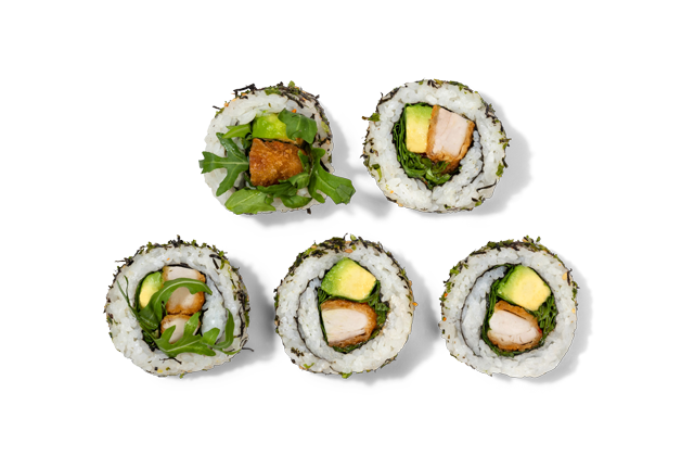 • 5x California XL Chicken Katsu (gefüllt mit frittiertem Hähnchen-Katsu, Avocado, Rucola, Chilisauce und scharfer Gewürzzubereitung)