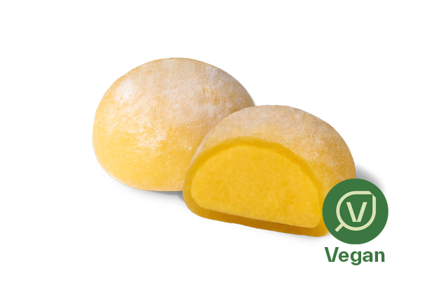 Veganes Reisdessert gefüllt mit einer Mangocreme, aufgetaut