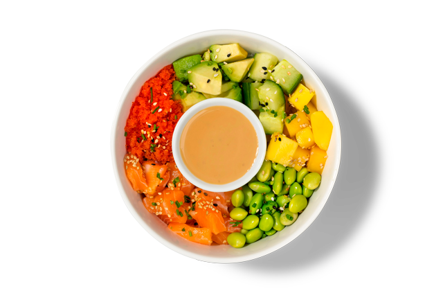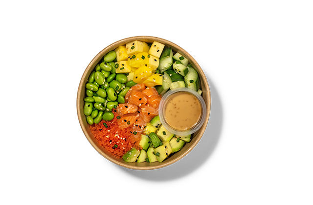 Inhalt: Reisschale mit Lachs, Gurke, Edamame, Avocado, Mango, Masago, Sesamsamen und Schnittlauch Topping.