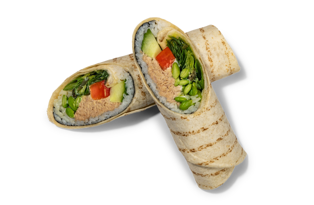 Unser Tuna Wakame Wrap beinhaltet zwei gegrillte Weizentortillas gefüllt mit Reis, Thunfischfüllung, Paprika, Gurke, grünen Sojabohnen, mariniertem Algensalat Wakame, Frühlingszwiebeln, Mayonnaise und Nori-Blatt.