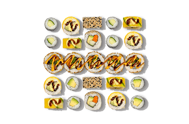 • 5x California XL Vegan Crunch (gefüllt mit Gurke, Avocado, Rucola, eingelegten Karotten, Röstzwiebeln und Teriyaki Sauce)