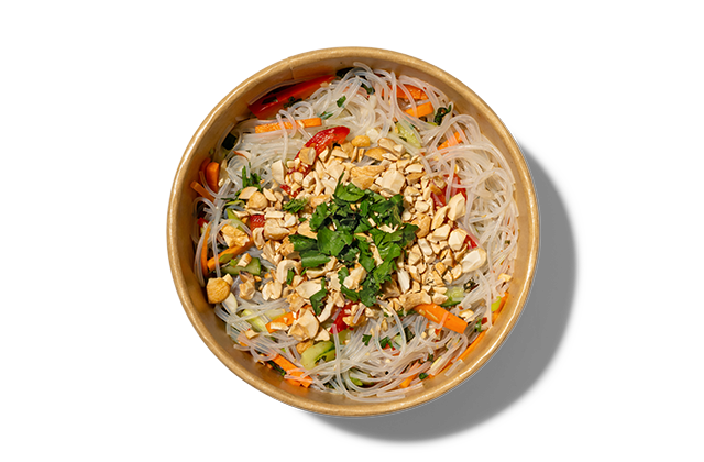Glasnudelzubereitung mit Cashewnüssen, Gurke, Karotte, Paprika, Koriander und Salatdressing asiatischer Art.